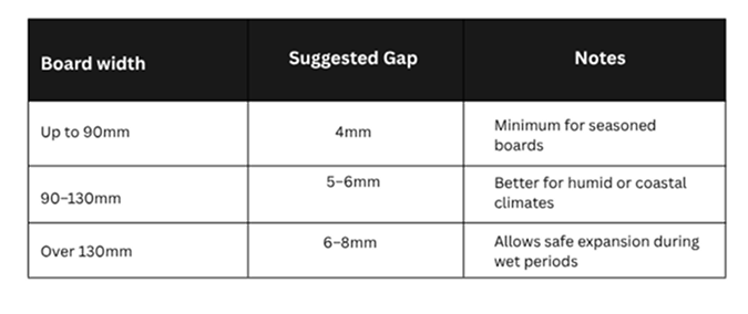 Timber Queensland and FWPA point out humid climates and wider boards need bigger gaps, usually 5 to 7mm works best.