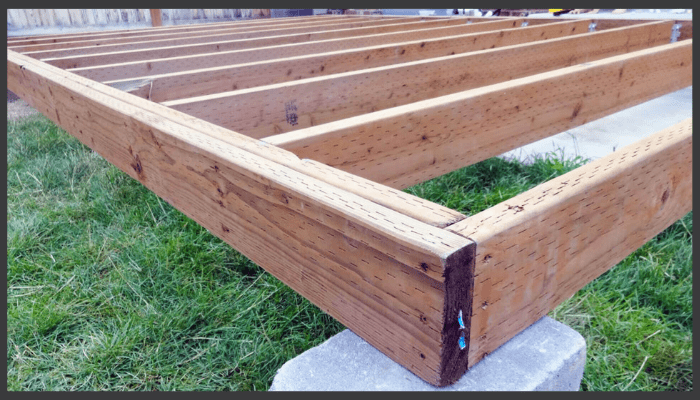 Cross block joists to stop twisting, and keep the subframe raised with minimum clearance (150 to 200mm) above ground. Use materials rated for exposure, like H3 or H4 treated bearers.